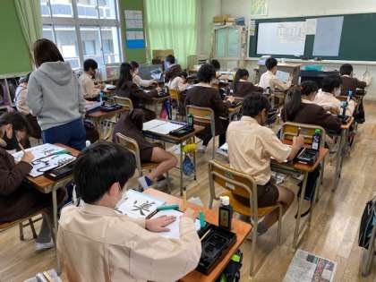 本日5時間目、5年生1・2組の授業のようすです。どちらも書写で、「美しい空」を書いています。