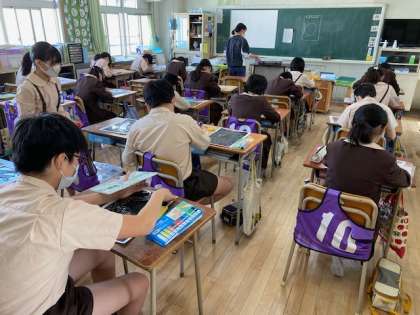 本日2時間目、6年生1・2組の授業のようすです。どちらも図工で、「ステンシル版画」を制作しています。