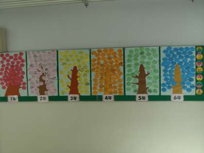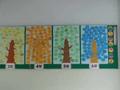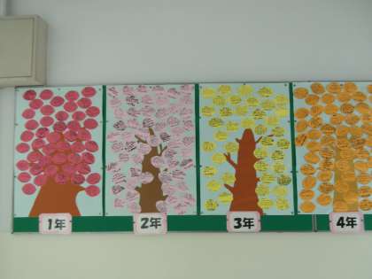 葉っぱ一枚一枚には、高学年への感謝のメッセージや下級生への優しい言葉かけなど、子どもたちの温かい気持ちで満ちあふれています。玄関前廊下の掲示板に掲示していますので、ご来校の際はぜひご覧いただけたらと思います。