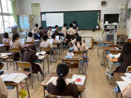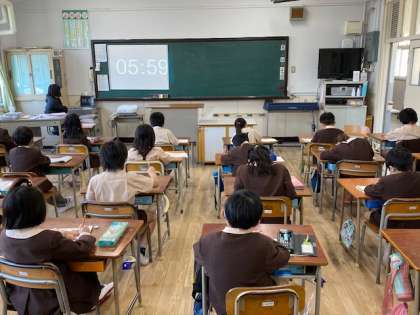 本日2時間目、2年生1・2組の授業のようすです。どちらも国語で、1組は漢字のテスト、2組は教科書の文章をノートに写しています。