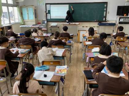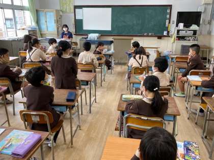 本日2時間目、2年生1・2組の授業のようすです。どちらも算数で、「かけ算のもんだいをつくってはっぴょうしよう」というめあてで学習しています。