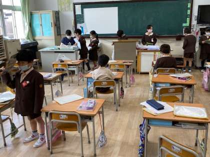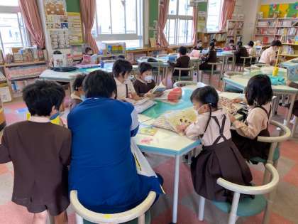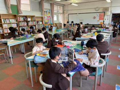 本日2時間目、1年生1・2組の授業のようすです。1組は図書の時間で、図書館で本を読んでいます。2組は算数の授業の前に、連絡ノートのチェックをしています。