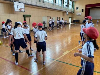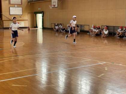 本日2時間目、6年生1・2組の授業のようすです。合同体育でシャトルランの記録測定をしています。結果を先生に報告しています。