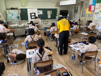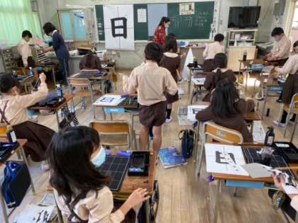 本日2時間目、3年生1・2組の授業のようすです。どちらも国語で、「日」の字の毛筆に取り組んでいます。
