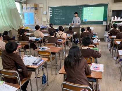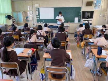 本日2時間目、4年生1・2組の授業のようすです。1組は社会で、防災のテストを返却して答合わせをしています。2組は書写で、ごんぎつねの絵を写して描いています。