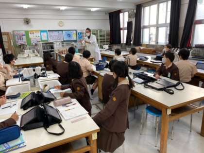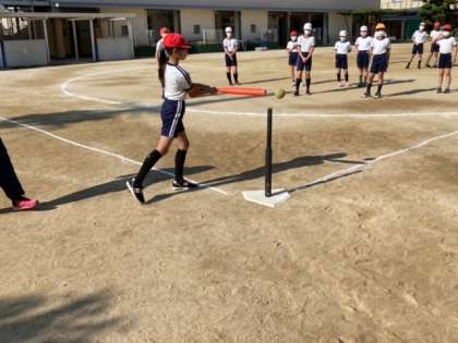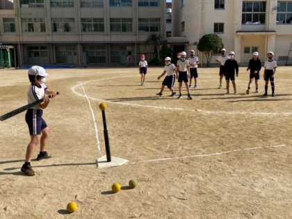 本日2時間目、5年生1・2組の授業のようすです。1組は体育で、「ティーボール」という野球に似た種目の練習をしています。2組は理科で、ふりこの実験の説明を聴いています。
