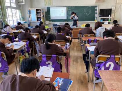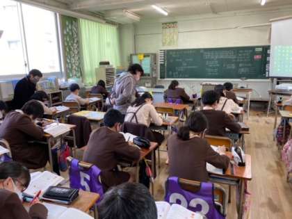 本日2時間目、6年生1・2組の授業のようすです。どちらも算数で、表を使って決まりを見つける学習に取り組んでいます。