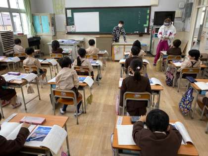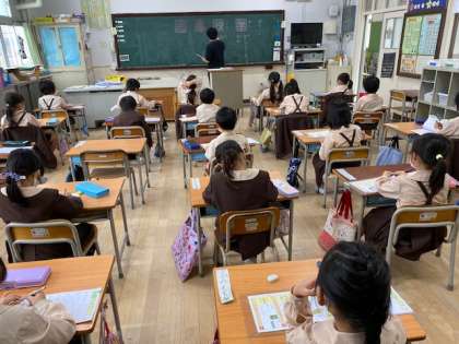 本日2時間目、1年生1・2組の授業のようすです。どちらも国語で、1組は新しい漢字の書き順を、2組は「いろいろなふね」の学習をしています。