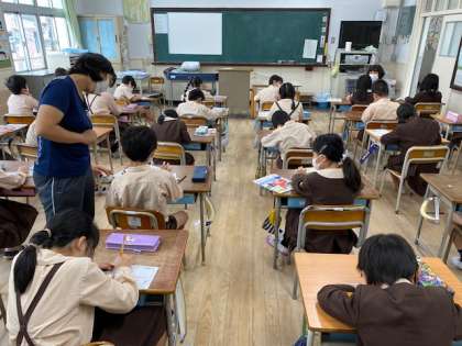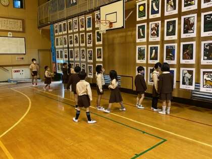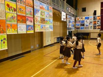 本日2時間目、2年生1・2組の授業のようすです。どちらも図工で、1組は作品展の鑑賞をしており、2組は1時間目に観た作品展の感想を書いています。