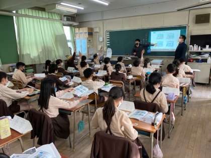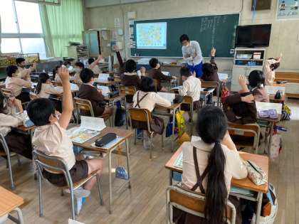 本日5時間目、4年生1・2組の授業のようすです。どちらも英語活動で、1組はC-NETの先生と担任で、2組は担任の先生だけで取り組んでいます。