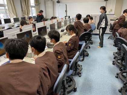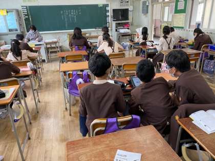 本日5時間目、6年生1・2組の授業のようすです。どちらも国語で、「世界に目を向けて意見文を書く」ための資料集めに1組はタブレットを使ったり、図書館で本を読んだりしており、2組はパソコン室で作業をしています。