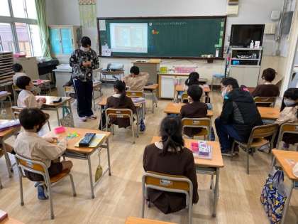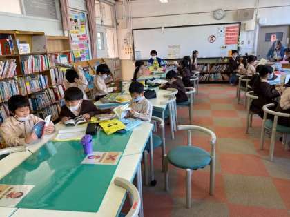 本日2時間目、1年生1・2組の授業のようすです。1組は図書の時間で、図書館で本を読んでいます。2組は算数で、三角形をたくさん組み合わせた形を使って図形の学習をしています。