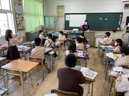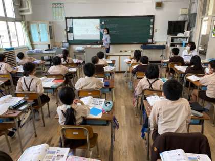 本日2時間目、2年生1・2組の授業のようすです。どちらも算数で、三角形の一部を直線で切ったときにできる図形についての学習をしています。