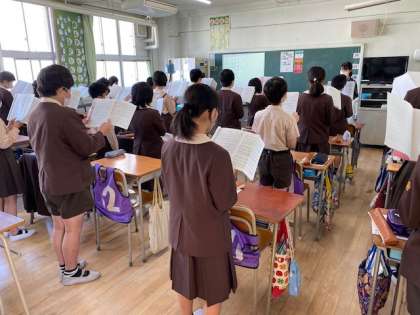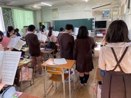 本日2時間目、6年生1・2組の授業のようすです。どちらも音楽で、卒業式に向けて歌の練習をしています。