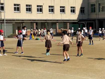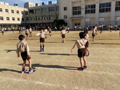 多くの児童がそれぞれの目標を目指してなわとびの練習に取り組んでいます。