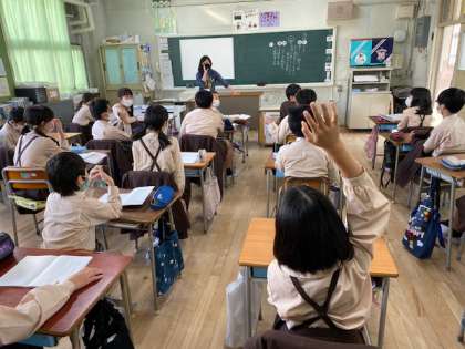 本日3時間目、5年生1・2組の授業のようすです。どちらも総合で、1組は家庭科のみそ汁つくりの準備を、2組は話し合いをしています。