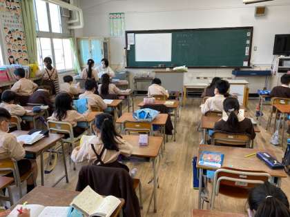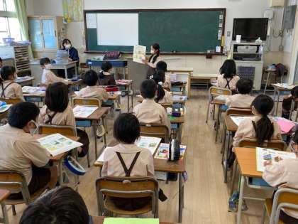 本日2時間目、2年生1・2組の授業のようすです。どちらも図工で、1組は「まどをひらいて」の作品の仕上げを、2組は「まどをひらいて」の作品をみんなの前で紹介しています。