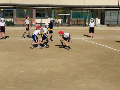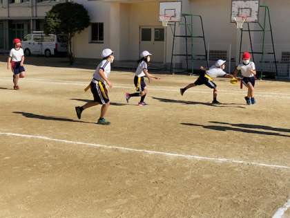 本日2時間目、4年生1・2組の授業のようすです。1組は社会で、天神祭について発表をしています。2組は体育でフラッグフットボールをしています。