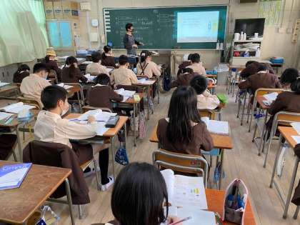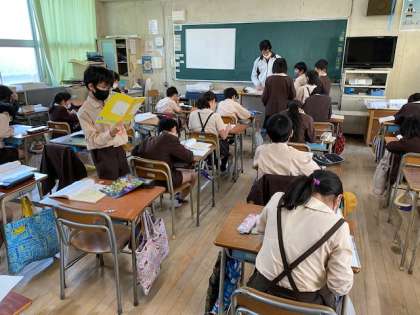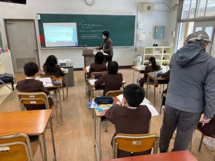 本日3時間目、4年生1・2組の授業のようすです。どちらも算数で、2クラスが3コースに分かれて「何倍かを表す数が小数になることもある」ことについて学習しています。