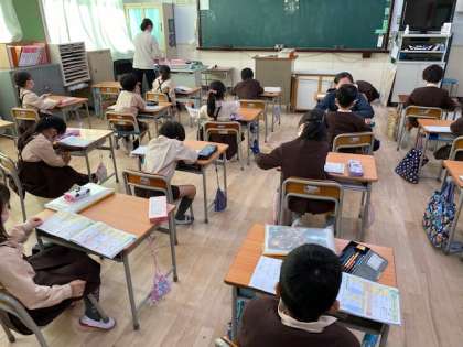 本日5時間目、1年生1・2組の授業のようすです。1組は2学期の振り返りプリントをしています。2組は書写で、「耳」の字の練習をしています。