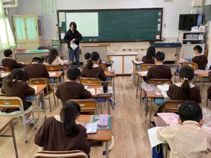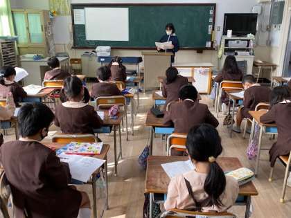 本日5時間目、2年生1・2組の授業のようすです。1組は算数で、小さな三角形の色紙を組み合わせてノートに貼っています。2組は国語で、テスト返却をして問題の解説をしています。
