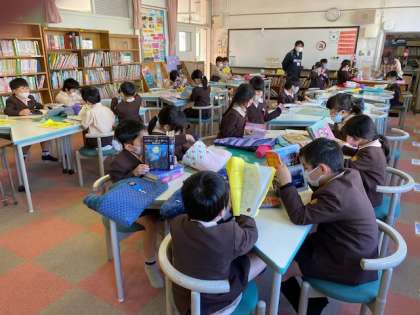 本日2時間目、1年生1・2組の授業のようすです。1組は図書の時間で、図書館で本を読んでいます。2組は算数で、「くりが13こあります 4こたべると、のこりはなんこですか」の問題に取り組んでいます。