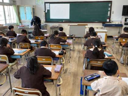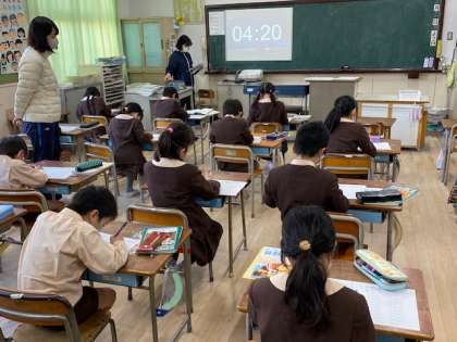 本日2時間目、2年生1・2組の授業のようすです。どちらも算数で、1組は「2ケタたす2ケタ(くり上がりあり)」の計算に、2組は九九のテストに取り組んでいます。