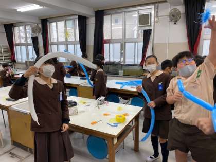 「科学クラブ」は、ペンシルバルーンを摩擦して静電気を起こす実験をしています。