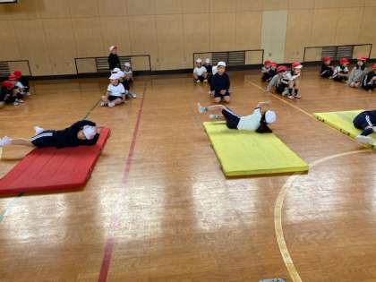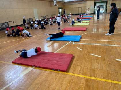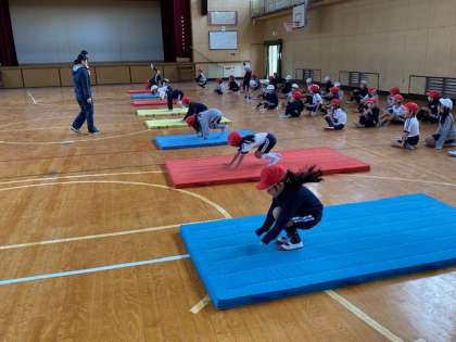 本日2時間目、1年生1・2組の授業のようすです。合同体育で、体育館でマット運動をしています。