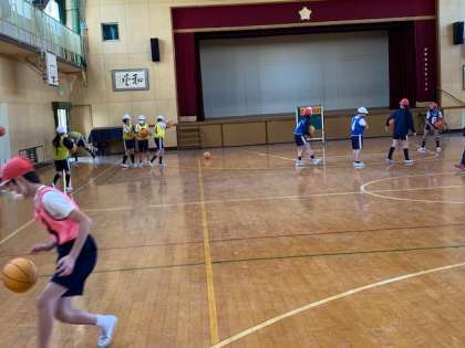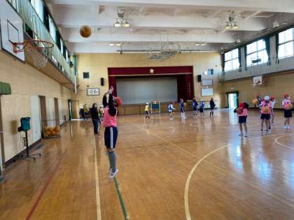 本日2時間目、5年生1・2組の授業のようすです。1組は体育で、「バスケットボール」の練習をしています。2組は理科で、タブレットを使って「流れる水のはたらきでできる地形」のプレゼンを作っています。