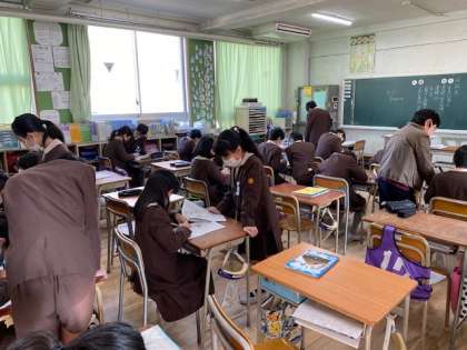 本日2時間目、6年生1・2組の授業のようすです。どちらも算数で、面積や体積のドリルをしています。できた人が分からない人に教えたりしています。