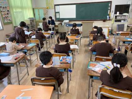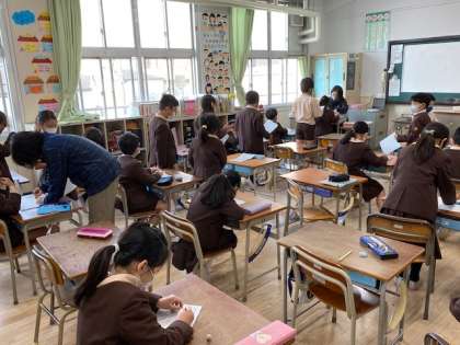 本日2時間目、2年生1・2組の授業のようすです。どちらも算数で、2ケタの足し算のプリントに取り組み、できた人から順番に点検を受けています。