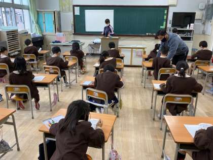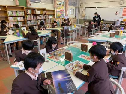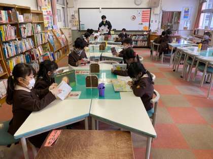 本日2時間目、1年生1・2組の授業のようすです。1組は図書の時間で、図書館で本を読んでいます。2組は学活で、「目標にチャレンジしましょう!」のプリント冊子に取り組んでいます。