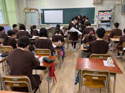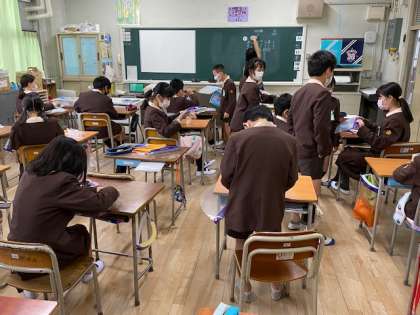 本日2時間目、5年生1・2組の授業のようすです。どちらも学活で、係決めをしたり新しいフェイスシールドを配付したりしています。