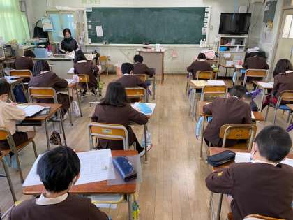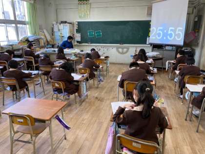 本日3時間目、3年生1・2組の授業のようすです。どちらも算数で、2学期のまとめのテストをしています。
