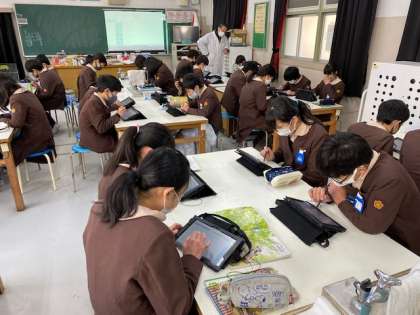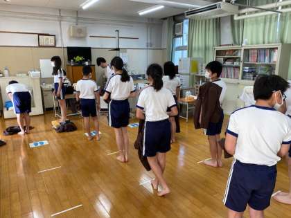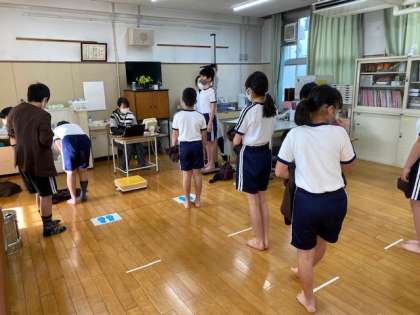 本日3時間目、6年生1・2組の授業のようすです。1組は理科で、タブレットを使って来週の経年調査に向けて練習問題を解いています。2組は保健室で身体測定を行っています。