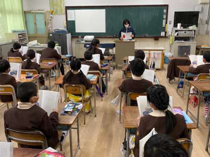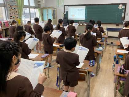 本日2時間目、2年生1・2組の授業のようすです。どちらも国語で、「かさこじぞう」を音読しています。