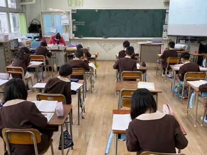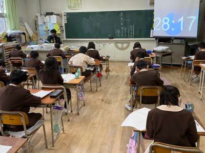 本日2時間目、3年生1・2組の授業のようすです。「大阪市小学校学力経年調査」の国語のテストを受けています。