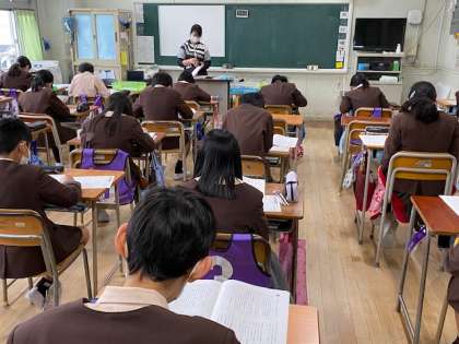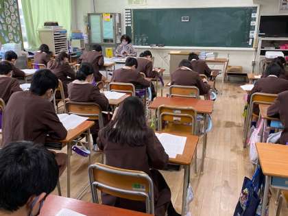 本日2時間目、6年生1・2組の授業のようすです。「大阪市小学校学力経年調査」の国語のテストを受けています。