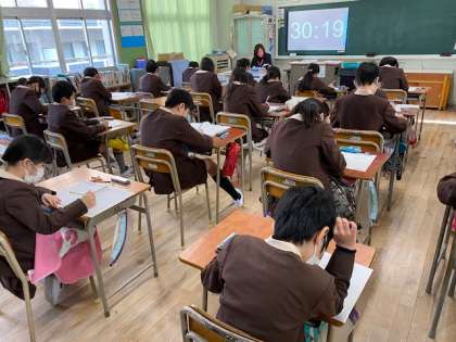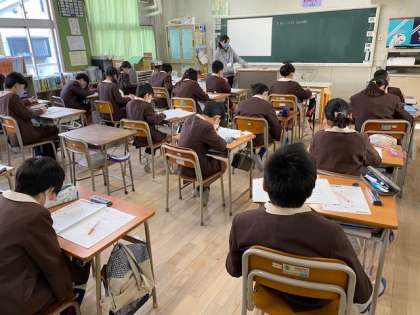 本日2時間目、5年生1・2組の授業のようすです。昨日の国語・社会に引き続き「大阪市小学校学力経年調査」の算数のテストを受けています。