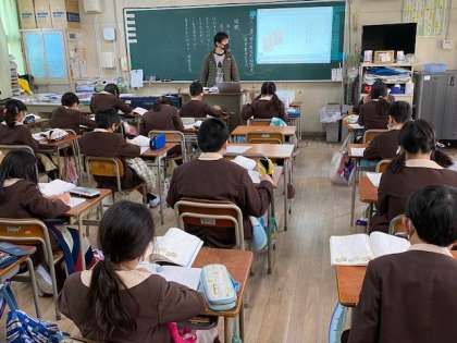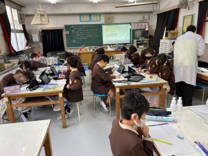 本日3時間目、4年生1・2組の授業のようすです。1組は国語で、「百人一首」の短歌を鑑賞しています。2組は理科で、「冬になると生き物のようすはどう変わるのだろうか」について予想して、調べる計画を班でたてています。