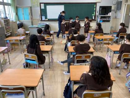 本日1時間目、1年生1・2組の授業のようすです。どちらも学活で、プリントを配付したり、係の人が保健点検をしたりしています。