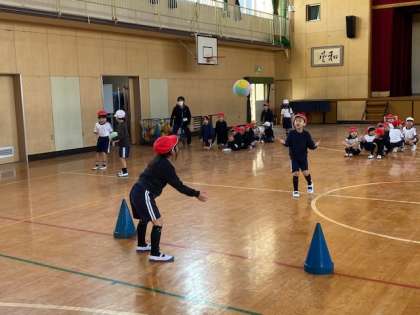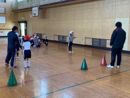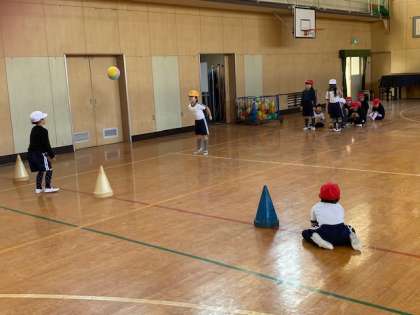 本日2時間目、1年生1・2組の授業のようすです。合同体育で、二人一組でボールを使って投げたりキャッチしたりする運動をしています。