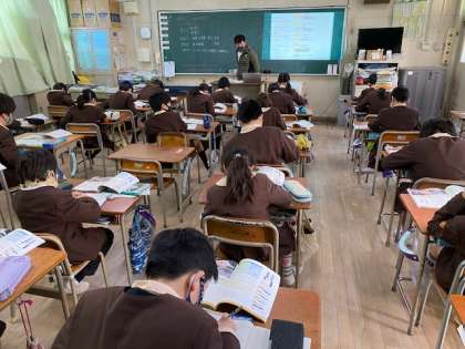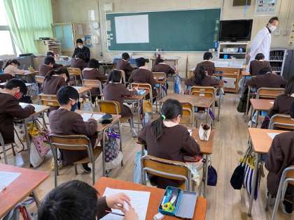 本日2時間目、4年生1・2組の授業のようすです。1組は社会で、「堺市で作られている包丁」について学習しています。2組は理科で、「星」や「生物」の単元のテストをしています。