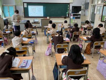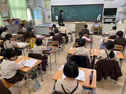 本日3時間目、1年生1・2組の授業のようすです。どちらも算数で、「おはじきを使ったゲームの点数の計算(足し算)」の学習をしています。