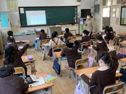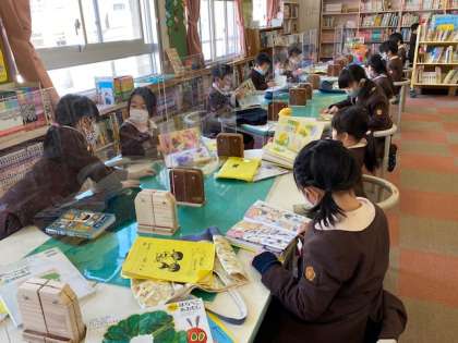 本日2時間目、1年生1・2組の授業のようすです。1組は図書の時間で、図書館で本を読んでいます。2組は算数で、「すうじビンゴ」をしています。