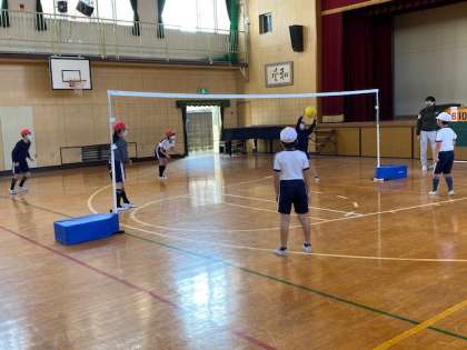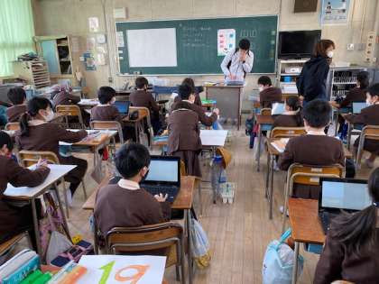 本日2時間目、4年生1・2組の授業のようすです。1組は体育で、「ソフトバレーボール」に取り組んでいます。2組は総合で、個人用端末で絵を描こうとしています。