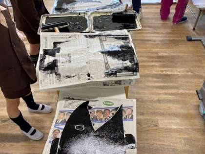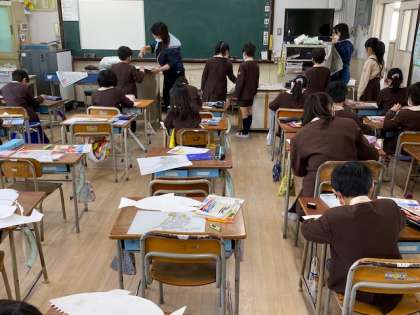 本日2時間目、2年生1・2組の授業のようすです。どちらも図工で、魚の紙版画を仕上げたり、できた人は塗り絵をしています。
