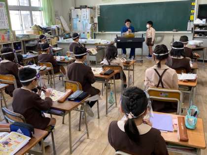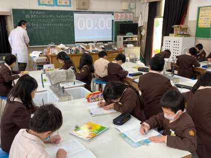 本日2時間目、3年生1・2組の授業のようすです。1組は音楽で、リコーダーの練習をしています。2組は理科で、「音が出ているときのもののようすはどうなっているか」を予想しています。