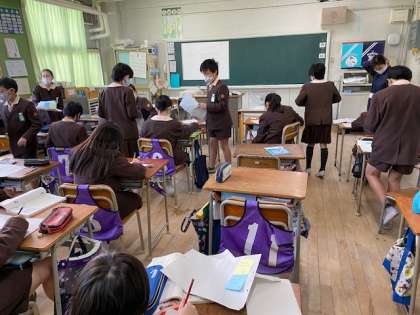 本日5時間目、5年生1・2組の授業のようすです。1組は学活で、「卒業を祝う会」の準備をしています。2組は国語で、「資料を見て考えたことを話そう」というテーマで、作文をしています。